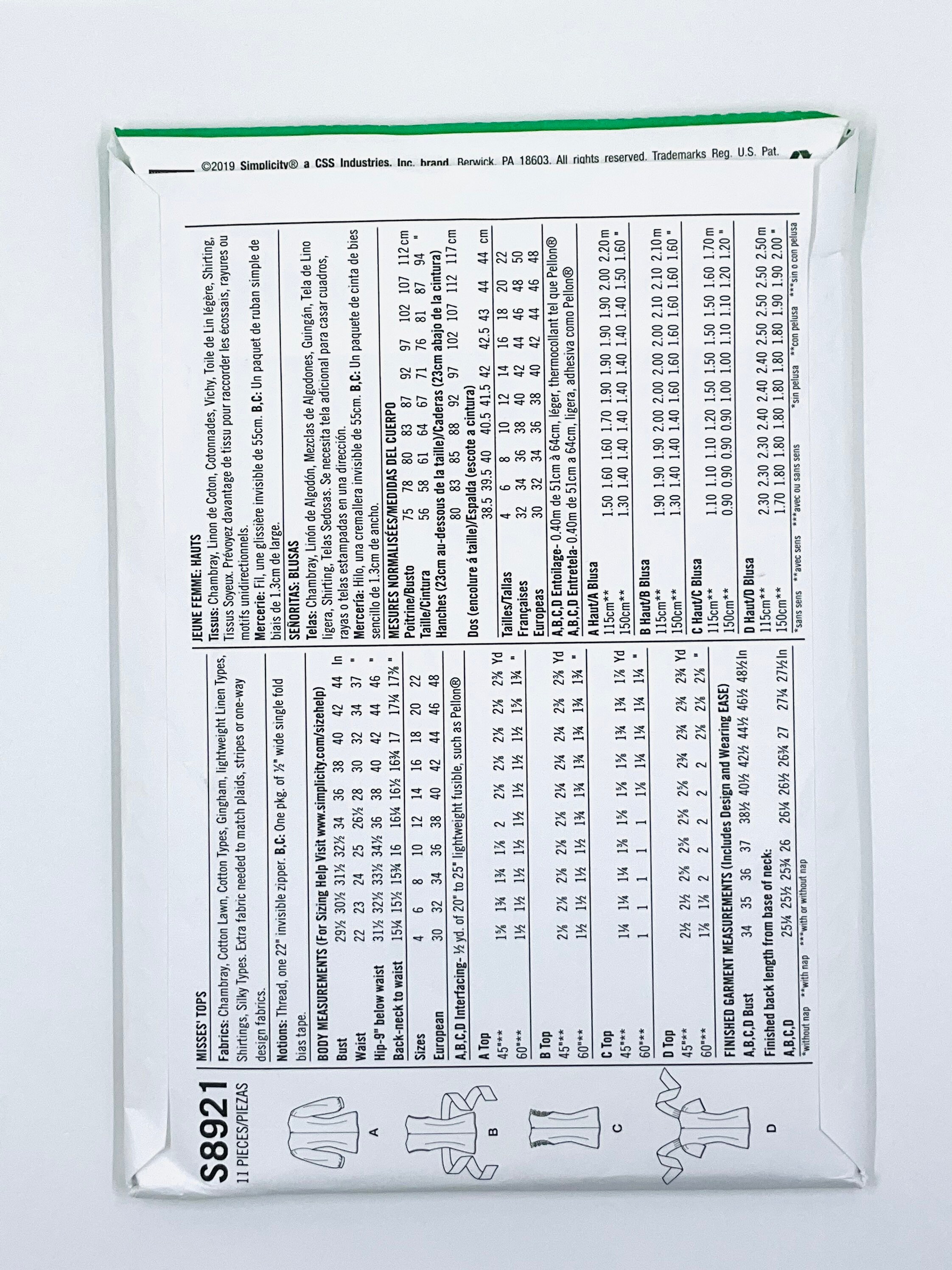 Simplicity 8921 Misses Tops Sizes 14 22 New And Uncut Sewing Pattern Ebay
